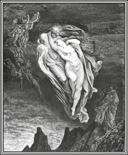 Содержание. Поэты спускаются во второй круг ада, меньший пространством, но исполненный большей муки. При самом входе они встречают Миноса, адского судью, занятого распределением по аду грешников, к нему беспрестанно прибывающих. При виде Данта, Минос прерывает на время исполнение своей обязанности и напоминает живому пришельцу о дерзости его предприятия; но теми же словами, которыми укрощен был Харон, Виргилий укрощает и Миноса. Между тем жалобные крики грешников начинают становиться явственными. Это крики сладострастных: среди вечного мрака неистовый вихрь адский вечно носит их во все стороны. Из их числа Виргилий поименовывает Данту некоторых, преимущественно женщин; но особенное внимание возбуждают две тени, неразлучно носимые бурею – тень Паоло Малатеста ди Римини и жены его брата, Франчески. Данте призывает их, расспрашивает о причине их мучений, и одна из двух теней рассказывает ему о начале и трагическом конце своей преступной любви. Потрясенный до глубины сердца состраданием к их участи, Данте лишается чувств и падает как мертвый.