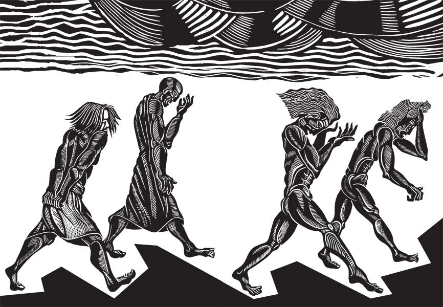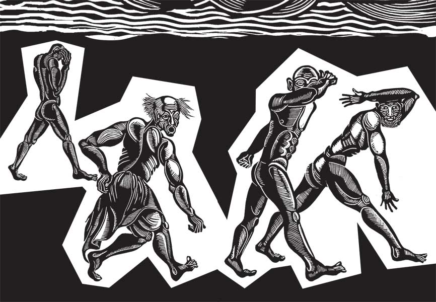 Мы ещё прислушивались к шелесту дерева, ожидая, что поведает оно, но тут вдруг раздался шум, лай и треск, как будто охотник в сопровождении собачьей своры гнался за вепрем. Слева от нас из чащобы выскочили двое. Их голые тела были исцарапаны в кровь, они неслись стремглав, ломая ветви. Один из них вопил: