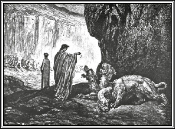 Содержание. Данте в третьем кругу ада. Здесь под градом, снегом и ливнем мутной воды казнятся обжоры, увязшие в грязной тине. Треглавое чудовище Цербер, страж этого круга, хватает грешников, четвертует их, сдирает с них кожу. С яростью бросается он на поэтов; но горсть земли, брошенная Виргилием в тройную пасть чудовищу, укрощает его. Поэты идут далее, попирая грешников, смешанных в одну отвратительную кучу с грязью. Один из них, флорентинец Чиакко, приподнимается и на вопрос Данта предсказывает ему будущие судьбы Флоренции и его собственное изгнание. Данте спрашивает его об участи некоторых флорентинцев и узнает, что они в более глубоких кругах ада. Попросив живого странника напомнить о себе своим сородичам, Чиакко упадает лицом в грязь и навсегда замолкает. В беседе о будущей неземной жизни Виргилий и Данте приходят в границе третьего круга и, спустившись в четвертый круг, встречают демона богатства, великого врага человечества, Плутуса.