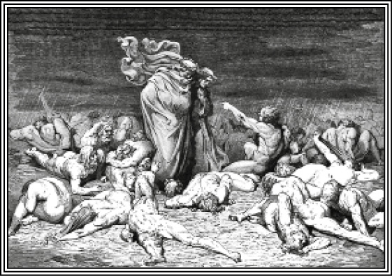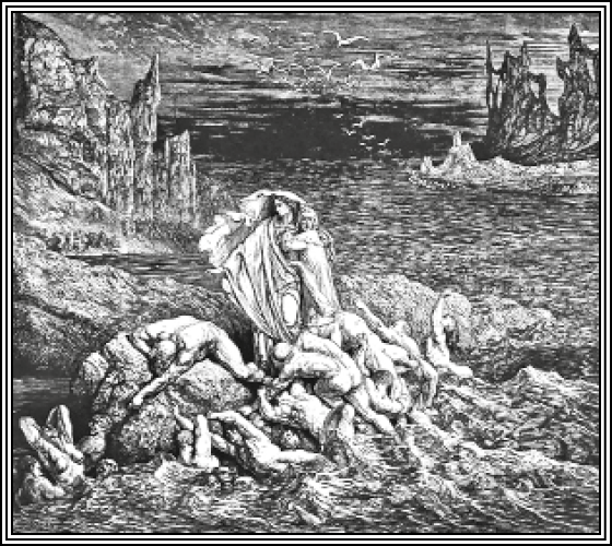112 Ногами, грудью, головой с тоски Они дрались, не только что руками, Зубами грызли плоть в куски, в куски.115 И вождь: «Мой сын, стоишь ты пред тенями, Которых гнев привел в такой раздор, И верь ты мне, что даже под волнами118 Вздыхает их неистовый собор И пузыри вздувает в сей трясине, Как зришь везде, куда направишь взор.121 Прислушайся, как во́пият в адской тине: “Мы были злы в веселой жизни той, Тая в себе дым медленный, и ныне124 Томимся здесь под тиною густой!» — Так в их гортанях клокотали клики, Захлебываясь черною водой.127 Меж озером и брегом круг великий Мы описали, с горестью сердец Смотря на грешных, издававших крики,130 Пока достигли башни наконец.Песнь VIII