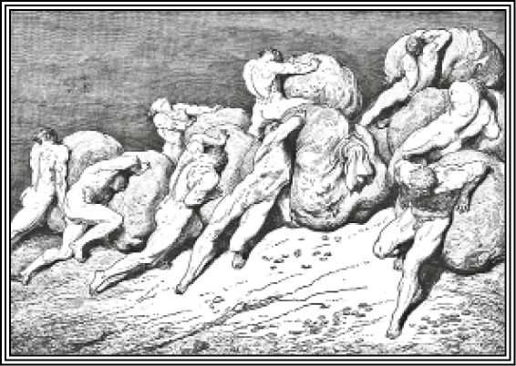Содержание. Напомнив Плутусу падение Люцифера и тем укротив его бешенство, Виргилий вводит Данта в четвертый круг. Здесь вместе наказуются скупые и расточители. С страшным воем вращают они огромные тяжести, каждый совершая свой полукруг, сходятся с двух сторон, сталкиваются с поносными речами и, расходясь, снова вращают свои камни на новую встречу. Узнав, что это большею частью духовные, папы и кардиналы, Данте хочет иметь подробные сведения о некоторых; но Виргилий объясняет ему, что жизнь их была так безвестна, что никого из них нельзя узнать. До Страшного суда продлится спор их; тогда скупые восстанут с сжатыми кулаками, а расточители – остриженные. По этому поводу Виргилий, намекнув о тщете даров счастья, изображает гения богатства – Фортуну. Уже полночь; путники идут далее и, пересекши четвертый круг, достигают кипучего потока, образующего грязное болото – Стикс. Следуя по его течению, они приходят в пятый круг. Здесь, в мутных волнах адского болота, души гневных дерутся между собою и рвут друг друга зубами. Под водою, в болотной тине, погружены сердитые и завистливые: они, дыша под волнами, вздымают пузыри на их поверхности и, испуская клики, захлебываются. Поэты обгибают болото, делают по его берегу большой круг и, наконец, приходят к башне.