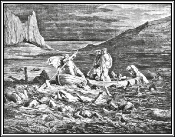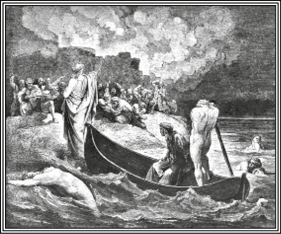 1 Я продолжаю. Прежде, чем мы были У основанья грозной башни сей, В ее вершине взор наш приманили4 Два огонька, блеснувшие на ней; Знак подавал им пламень одинокий В дали, едва доступной для очей.7 И, в море знаний погружая око, Спросил я: «Вождь, кто знаки подает? Что огонькам ответил огнь далекий?»10 И вождь в ответ: «Над зыбью грязных вод Не видишь ли, кто мчится к нам стрелою? Иль для тебя он скрыт в дыму болот?»13 Лук с тетивы с подобной быстротою Не мечет стрел на воздух никогда, С какой, я зрел, над мутною волною16 Навстречу к нам стремился челн тогда; Его рулем один лишь кормщик правил, Крича: «Злой дух, пришел и ты сюда?»19 «Флегъяс, Флегъяс! ты к нам вотще направил, — Сказал мой вождь, – свой крик на этот раз: Мы здесь затем, чтоб нас ты переправил».21 Как злится тот, кто выслушал рассказ О том, какой над ним обман свершился, Так бешенством объят был Флегиас.25 Вождь сел в ладью, за ним и я спустился, И лишь тогда, как сел я близ вождя, Летучий челн, казалось, нагрузился.