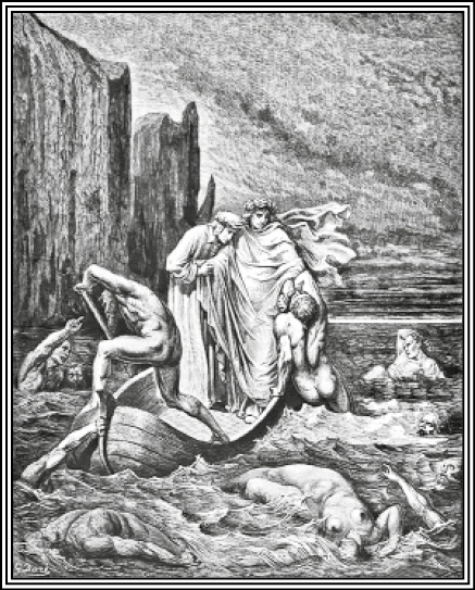 28 И лишь мы сели, древняя ладья Как молния помчалась издалека, Зыбь глубже, чем когда-нибудь, браздя.31 Так плыли мы вдоль мертвого потока; Вдруг весь в грязи дух выплыл из ручья, Вскричав: «Кто ты, идущий прежде срока?»34 А я: «Иду, но не останусь я; Но кто ты сам, весь в тине, безобразный?» И он: «Ты видишь: плачет тень моя!»37 «Так плачь же, дух проклятый, безотвязный! — Воскликнул я, – и множь печаль свою! Теперь узнал я, кто ты, призрак грязный!»