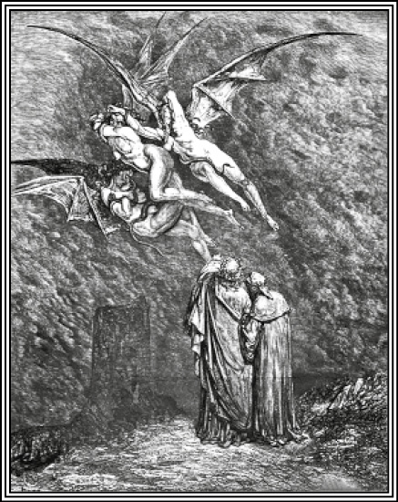 Содержание. На два сигнальные огонька с башни отвечает третий вдали над болотом. Между тем с быстротою стрелы несется по волнам челнок навстречу путникам: это ладья Флегиаса, кормщика адского болота. С бешенством окликает он Данта, но, укрощенный Виргилием, принимает поэтов в свою ладью. Они плывут. Тогда из воды поднимается тень флорентинца Филиппа Ардженти и силится опрокинуть ладью; но Виргилий отталкивает, а грешники увлекают свирепого флорентинца; он в бешенстве грызет самого себя. Между тем страшные крики оглушают поэтов: они приближаются к адскому городу Дис, с огненными башнями, окруженному глубокими рвами. У ворот города поэты выходят на берег; но тысячи падших с неба ангелов возбраняют им вход. Виргилий ведет с ними переговоры; демоны согласны впустить Виргилия, но Данте должен один возвратиться. Он в ужасе. Виргилий, обещая не покидать его, снова переговаривает с демонами; но те пред его грудью запирают ворота города и оставляют поэта за порогом. Виргилий возвращается к Данту; он сам в сильном смущении, однако ж утешает живого поэта скорым прибытием небесной помощи.