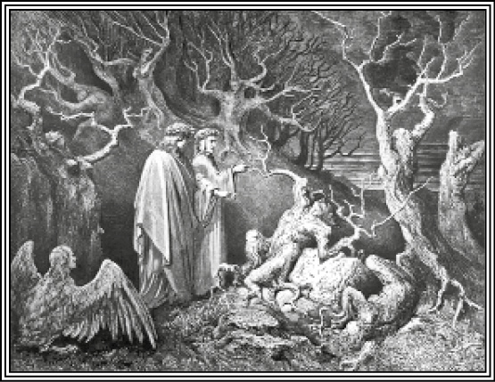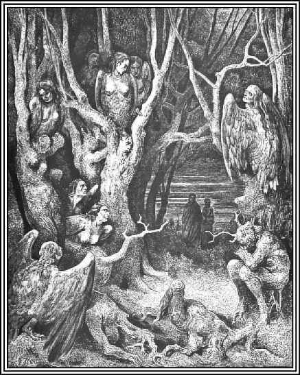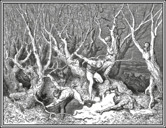 13 На крыльях длинных, с человечьим ликом, С когтьми на лапах, с чревом птиц, они На страшных пнях кричат в смятенье диком.16 «Пока мы здесь, – сказал учитель мне, — Узнай, мой сын, ты во второй долине, И будешь ты дотоле в сей стране,19 Пока к ужасной не придешь пустыне; Смотри ж теперь: ты здесь увидишь то, Что подтвердит слова мои отныне».22 Со всех сторон я слышал вой; но кто Стонал и выл, не зрел я, и в смятенье Я стал, от страха обращен в ничто.25 Вождь, думаю, мог думать, что в сомненье Подумал я: не скрылся ли в кусты От нас народ, рыдавший в отдаленье;28 И потому сказал он: «Если ты Одну хоть ветку сломишь в роще темной, То вмиг рассеются твои мечты».31 Вблизи от нас терновник рос огромный: Я ветвь сломил с него; но он с тоской: «За что ломаешь? – простонал мне томно,34 И, потемнев от крови пролитой, Вскричал опять: «Что множишь мне мученья? Иль жалости не знаешь никакой?37 Когда-то люди, ныне мы растенья; Но будь мы души змей самих, и к ним Иметь ты должен больше сожаленья».