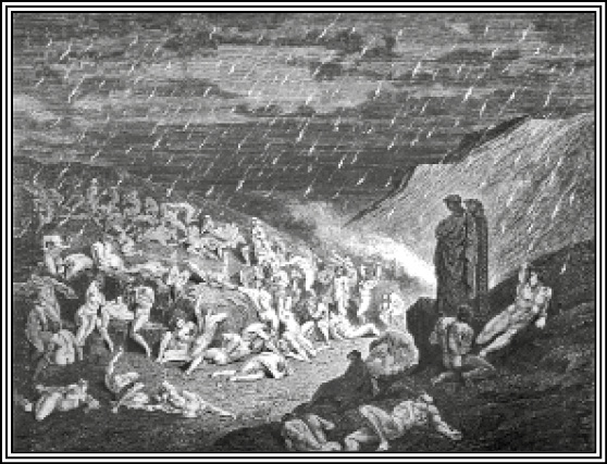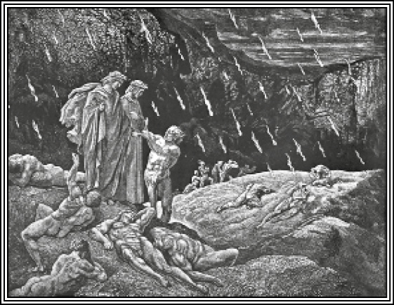 Содержание. При имени Флоренции, Данте, растроганный любовью к отечеству, подбирает разбросанные листья флорентинца и складывает их вокруг его куста. Затем поэты приходят к границе, отделяющей второй отдел седьмого круга от третьего, где казнится насилие против Бога. Пред глазами Данта открывается необозримая и бесплодная степь, горячие пески которой вечно раскаляются огнем, падающим на них длинными полосами. Грешники образуют из себя три стада: одни лежат навзничь: кто богохулители; другие сидят, скорчившись: кто ростовщики; третья, самая большая толпа содомитов находится в вечном бегстве. – Потом, все более и более удаляясь от леса и миновав первую толпу богохулителей, поэты приходят к клокочущему потоку Флегетону, на который Виргилий обращает особенное внимание Данта и при этом случае объясняет ему происхождение адских рек. Все воды адских рек происходят от слез статуи Времени, в образе старца стоящей на горе Иде********и литой из золота, серебра, меди, железа и глины. За исключением головы, литой из золота, все части ее тела прорезаны морщинами от слез, которые, сливаясь в ад, образуют Стикс, Ахерон, Флегетон и Коцит. Данте спрашивает о Лете и узнает, что река забвения помещена в чистилище. – Затем путники пересекают песчаную степь, идя мощеным берегом Флегетона, над которым гаснет огонь.
