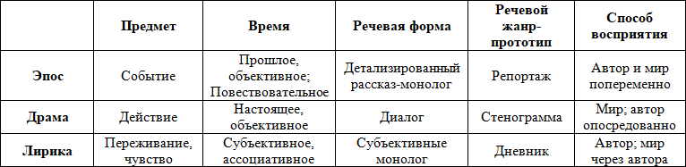 Получается, что принципом деления художественной литературы на роды являются способы представления человеком случившегося. Чтобы не запутаться в них, полезно выделить ряд признаков, по которым их можно чётко различать. К счастью, в книге «Структура и смысл: Теория литературы для всех» автор, Игорь Николаевич Сухих, приводит таблицу, в которой эти признаки объединены в единую систему.