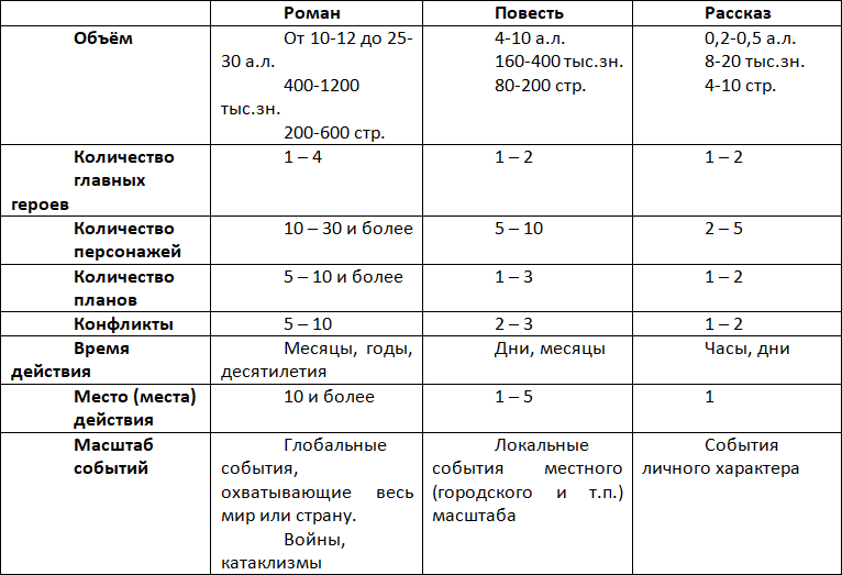 Как вы могли заметить, характеристики романа в таблице имеют очень большой диапазон. По сути, они вмещают в себя большие жанры в том смысле, о котором говорит Игорь Николаевич Сухих в книге «Структура и смысл: Теория литературы для всех». Т. е. самые большие величины характеризуют эпопею, а самые маленькие роман.