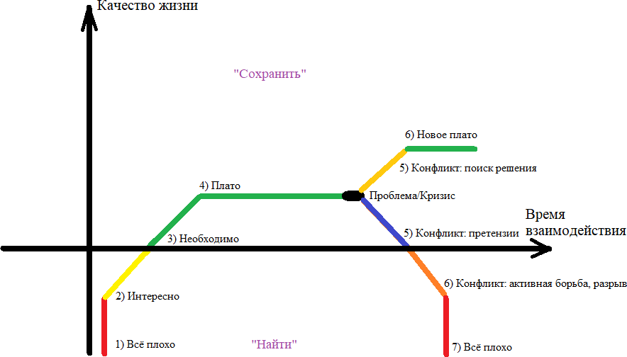 Вертикальная ось отражает качество жизни человека, горизонтальная – время взаимодействия человека с другими людьми. Качество жизни – это полнота удовлетворения потребностей. Время взаимодействия – продолжительность отношений. Деления с 1-го по 7-е – это фазы развития отношений. Или этапы, название сути не меняет.