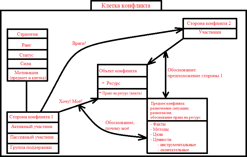 Сразу отмечу, что все стрелки, квадраты и обозначения, относящиеся к стороне конфликта 1, точно также относятся и к стороне конфликта 2, только в другую сторону, соответственно. Итак, взгляните на картинку: