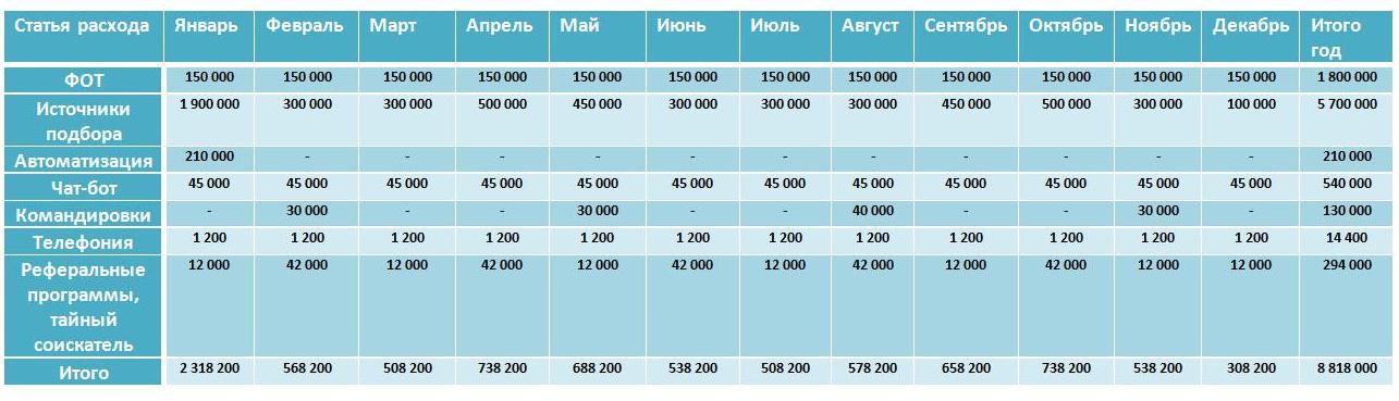 Никогда не закладывайте одинаковую сумму на каждый месяц, делайте это согласно вашей потребности в персонале. Тогда вам будет легче обосновывать все суммы, а сами знаете, что основная статься расхода в вашем бюджете – это источники подбора персонала. Я на своем опыте поняла, что так на много легче обосновывать бюджет, нежели «размазывать» общую годовую сумму на весь год.
