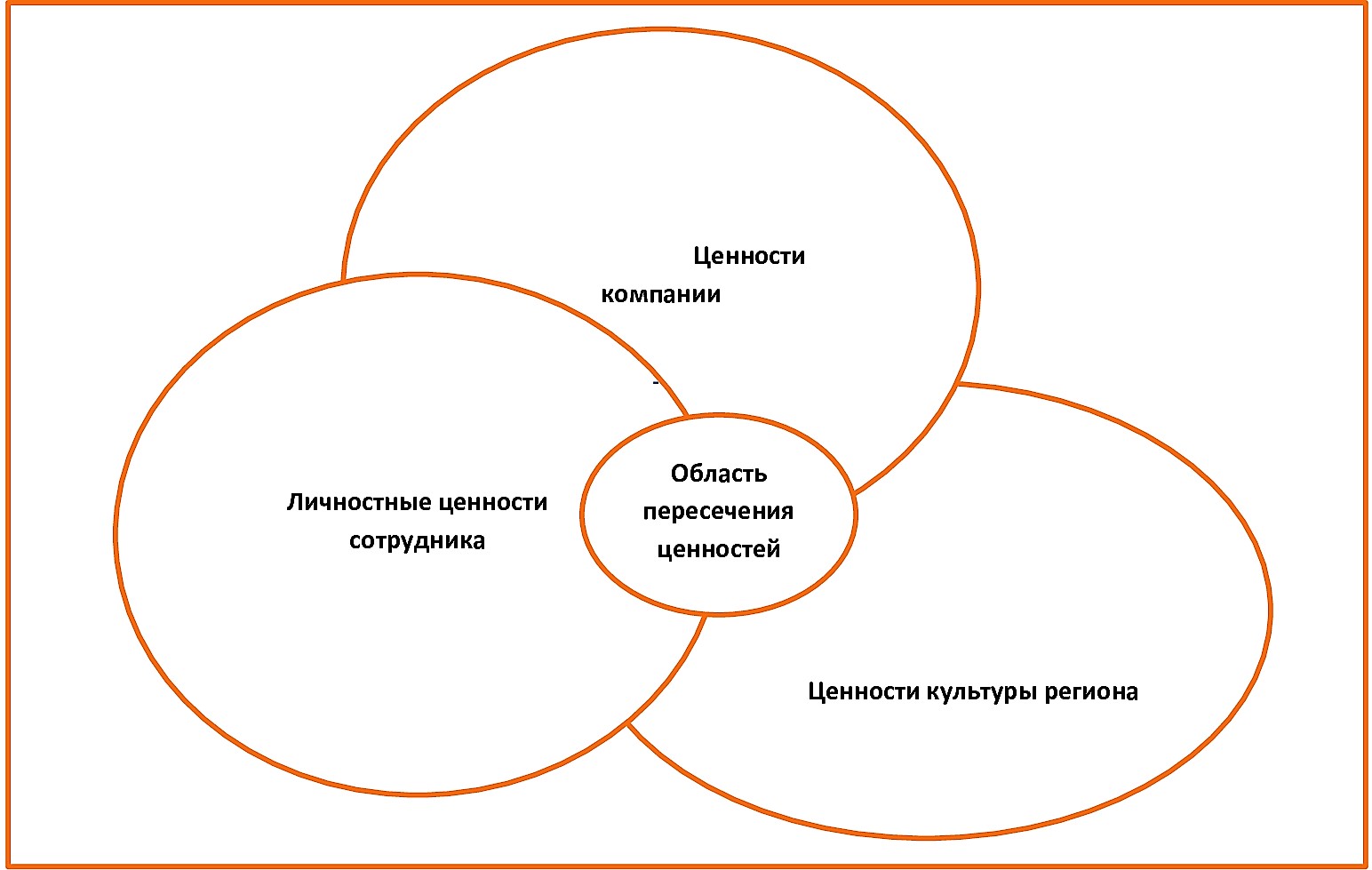 Ответ на вопрос, должны ли ценности корпоративной культуры становиться эхом ценностей культуры и общества не так уж прост. Здесь имеют значение несколько факторов – форма собственности, взгляды лидеров, этап развития компании, формальный или неформальный подход к вопросам корпоративной этики. На практике, особенно у крупных компаний, ценности дублируют широкие этические конструкты гуманистической, общечеловеческой направленности, и в то же время, обещают следовать многовековым российским культурным традициям, не объясняя, как это совмещается. Такая ценностная позиция компании мало чем поможет соискателю определиться с выбором работодателя, а сотруднику не даст аргументов в беседе о достоинствах компании, не прибавит ясности в планировании рабочих отношений с компанией на перспективу. Ценности компании, по нашему мнению, должны носить локальный характер в сравнении с ценностями культуры и общества (рис.5), акцентировать внимание клиентов, сотрудников, соискателей и социальных институтов региона на своем главном ценностном направлении, которое вначале нужно еще определить для себя. Важно, чтобы ценности ясно и четко показывали вектор развития компании, а не дублировали формально статьи Конституции РФ о свободе человека.
