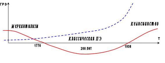 Первый исторический этап: Эпоха государственного регулирования экономики. Идеологи меркантилизма были убеждены, что только деньги (золотые и серебряные) и сокровища олицетворяют богатство нации, государства. Приумножение богатства, полагали они, требует протекционистских мер по регулированию внешней торговли и того, чтобы поощрялся экспорт, сдерживался импорт и, всемерно поддерживалась национальная промышленность. По меркантилистской концепции достижение активного торгового баланса увязывается непременно с мерами государственного вмешательства, а источником богатства считается неэквивалентный обмен в результате торговых взаимоотношений с другими государствами.