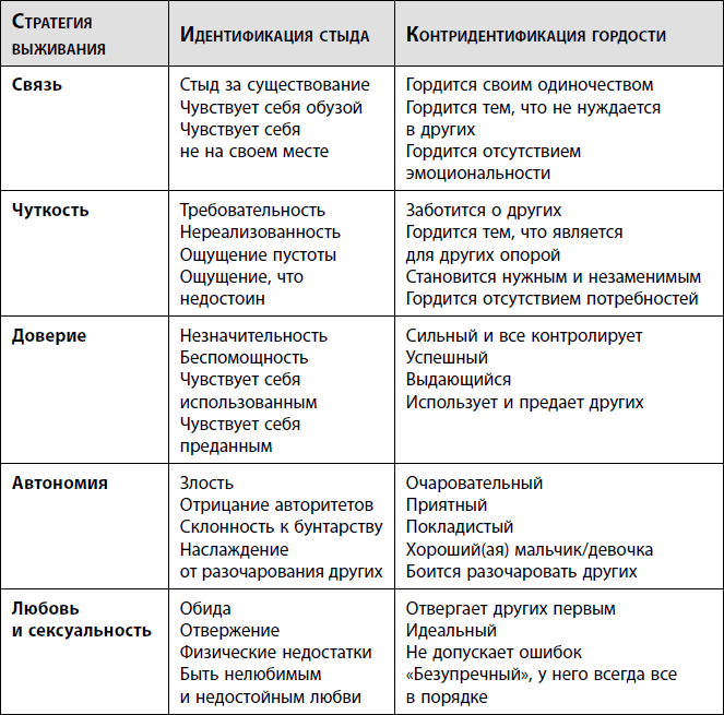 Идентификации стыда и контридентификации гордостиКаждая адаптивная стратегия выживания опирается на ряд идентификаций, связанных со стыдом, которые развиваются из-за ошибок раннего развития. Кроме того, у большинства людей в ответ на скрытый стыд развиваются и контридентификации, основанные на гордости. Это идеальное «я», которое отражает, как они хотели бы выглядеть в собственных глазах и в глазах окружающих. Контридентификации гордости, которые традиционно считаются защитными механизмами, являются попытками превратить стыд в благо. Однако, как ни парадоксально, чем больше энергии человек вкладывает в эти попытки, тем сильнее становятся идентификации стыда. Вкратце это представлено в таблице I.4.