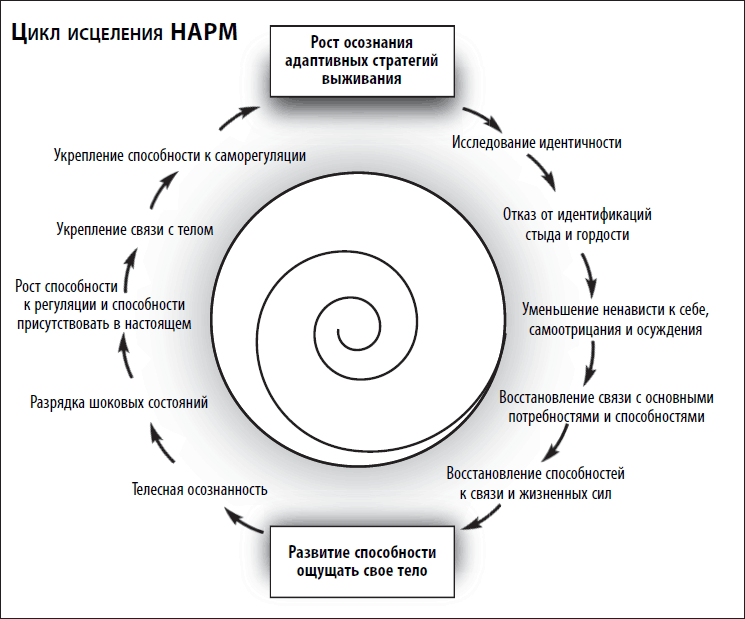 НАРМ запускает цикл исцеления (см. приложение I.5), в ходе которого развивается способность к регуляции нервной системы, а искажения идентификаций и убеждений постепенно уменьшаются и в результате исчезают. В позитивном цикле исцеления регуляция нервной системы помогает избавиться от болезненных идентификаций. Вместе с тем как исчезают болезненные идентификации и суждения, крепнет и способность к саморегуляции.