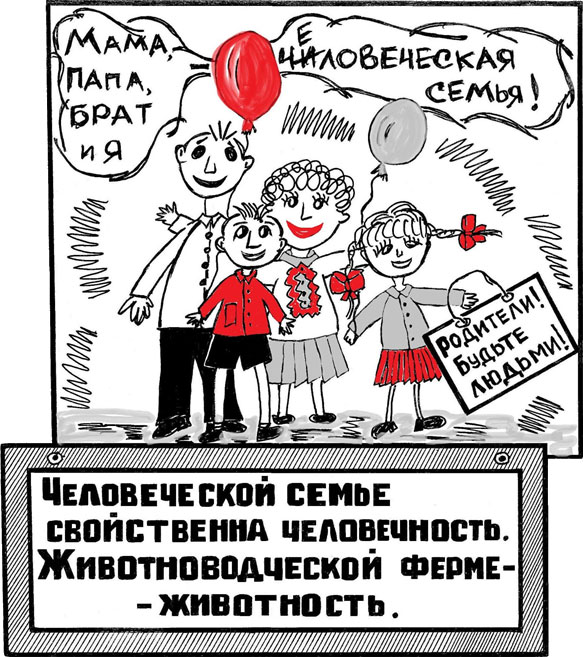 У феноменальных родителей, осознающих, что для животноводческой фермы характерна животность, а человеческой семье свойственна человечность, получается создать настоящую человеческую человечность в своей семье. Их девиз: «Долой животность из человеческой семьи!»