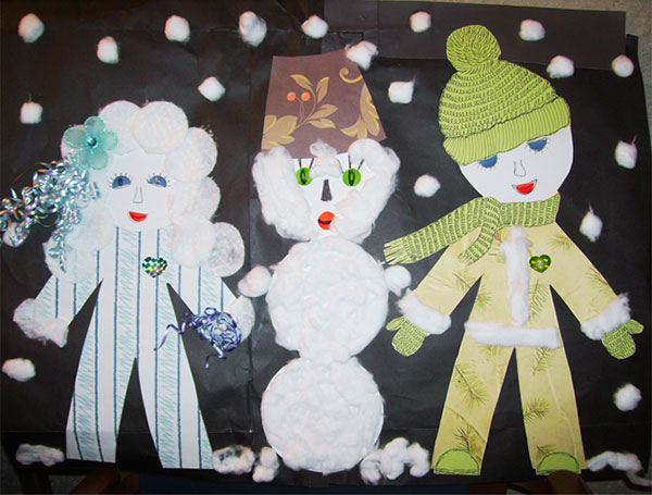 Бабушка Аля объяснила, что украшать бумажно-картонные фигурки можно самыми разными материалами: ватой, наклейками, искусственными цветами и листьями, фрагментами мочалок и пряжей для вязания, пуговицами и пряжками, бусинками и бисером, блёстками и другой новогодней мишурой, лоскутами ткани и ватой, лентами и тесьмой и проч. Близнецы с ней, конечно, согласились. Вот, что у них получилось: