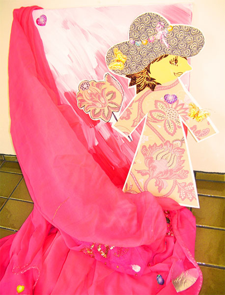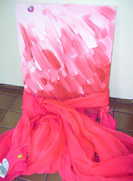 Затем близнецы взяли отдельный лист картона и покрасили его большими розовыми мазками, а бабушка Аля задрапировали лист яркой тканью.