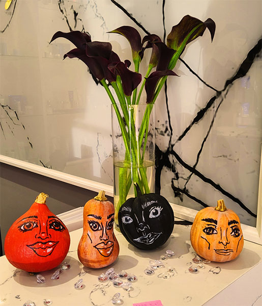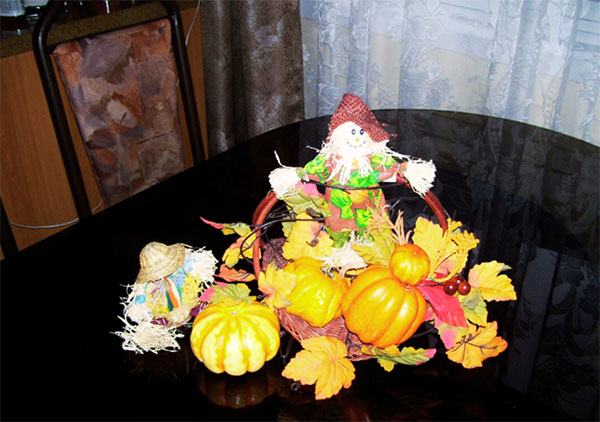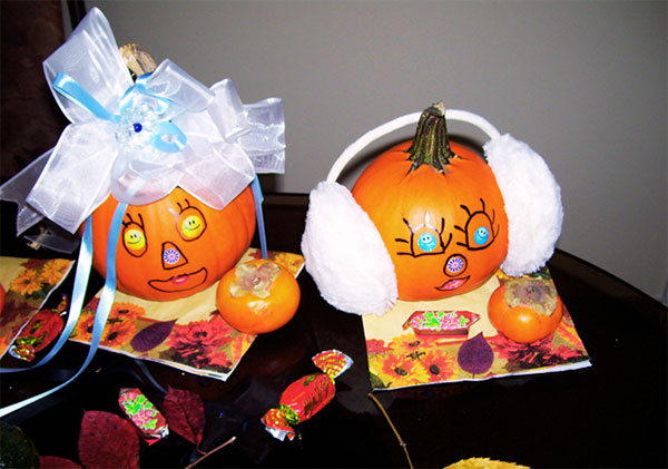 Композиции с тыквами были дополнены другими плодами: кабачками, патиссонами, яблоками, дынями, арбузами, початками кукурузы, а также прутьями, сучками, шишками, свечами, листиками и даже игрушками. На некоторых овощах близнецы нарисовали глазки и улыбающиеся рты.