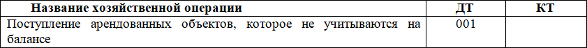 В табличной части в колонке Дебет указывается счет 001 «Арендованные основные средства» и аналитика к нему, субконто 1 (Контрагенты), субконто 2 (Основные средства).