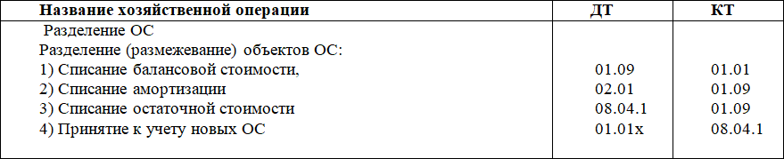 При разделении одного объекта недвижимого имущества на несколько, первоначальный объект основных средств фактически не выбывает, а образует несколько отдельных объектов и таким образом продолжает использоваться в деятельности организации. Такое изменение (разукрупнение) объекта не приводит к каким-либо экономическим последствиям (экономические выгоды организации не увеличиваются и не уменьшаются), т. е. ни доходов, ни расходов в данном случае не возникает.