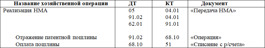 При реализации НМА на дату регистрации перехода исключительного права по договору об отчуждении права на изобретение их стоимость, учтенная на счете 04 «Нематериальные активы», уменьшается на сумму амортизации, накопленной за время использования актива по дебету счета 05 «Амортизация нематериальных активов». Остаточная стоимость списывается со счета 04 «Нематериальные активы» на счет 91 «Прочие доходы и расходы» и признается прочим расходом организации.