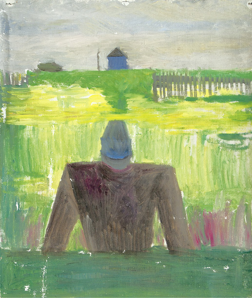 Человек на переднем плане сидит на траве или на скамейке или стоит за ограждением – за темно-зеленой полосой. Я додумываю детали, описывая картину словами, представляя себя на месте этой полуфигуры. Я сижу на земле, ощущаю ее неровности, уколы сухой травы; пахнет клевером и навозом; слышу голос животного (птица? лягушка?); ветер не холодный; припекает. Смотрю на дом, на забор, вспоминаю поездки на картошку на первом курсе; вспоминаю о заборах в Подмосковье (они не такие, как на картине).
