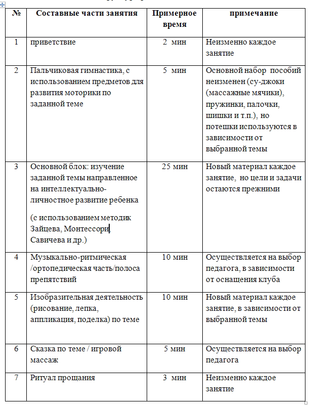 Занятия рассчитаны час, но в зависимости от правил, наполняемости групп и оснащения вашего клуба, могут проводиться как полуторачасовые. Так же отдельной главой, предлагаются варианты приветствия, прощания в кругу, так же варианты для игрового массажа и пальчиковой гимнастики, которые не вошли в предложенные занятия, но проверены и активно используются педагогами нашего центра. Структура развивающего занятия представлена в таблице.