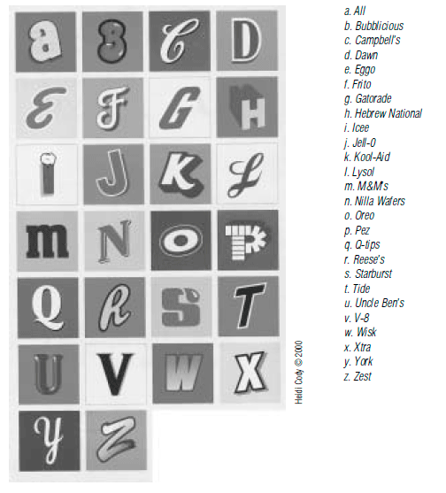 Художник и культурный антрополог Хайди Коуди в своей работе, представленной выше под названием «Американский алфавит», сделала вывод, что для узнавания бренда потребителям бывает достаточно увидеть всего одну букву (справа приводятся названия брендов, символизируемых данной буквой).