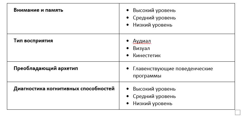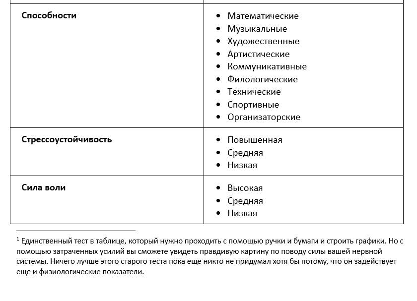 Ниже вы увидите таблицу показателей (я провожу по ней диагностику своих клиентов), по которым можете самостоятельно провести чекап своего психологического состояния, прежде чем начать работу с книгой. Эта диагностика покажет вам, каким главам и упражнениям в книге стоит уделить особое внимание. Пройдя самодиагностику, вы получите незаменимого помощника в жизни – ваш психологический портрет, который одновременно является вашей картой ресурсов. Файл с ссылками на онлайн-тесты может по запросу получить каждый подписчик моего телеграм-канала «Психолог о самопознании» (https://t.me/self_support1).