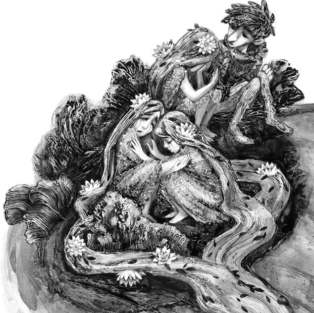 Перед ней на небольшом бревне сидел Варн в окружении трёх обливающихся слезами русалок. Одна из них рыдала Варну в плечо, ещё две ревели, обнявшись.