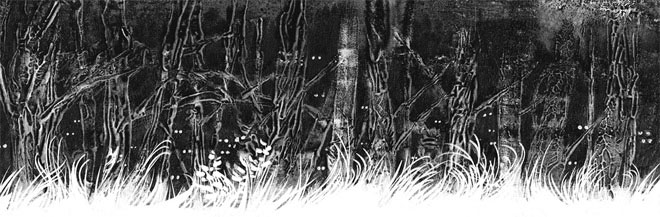 Ойкью обернулась и недоумённо взглянула на Хозяина Клёна. Тот растерянно пожал плечами. Обменявшись удивлёнными взглядами, они осторожно двинулись на звук. Плач привёл их к небольшой полянке недалеко от болот, и взгляду Ойкью предстала удивительная картина. Она сперва не совсем поняла, что видит перед собой, а когда поняла, не поверила своим глазам, так что несколько секунд стояла и глупо моргала.
