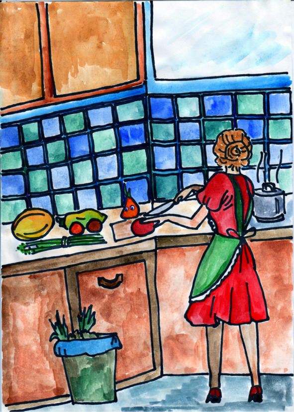 Маленькая Луковица проснулась на кухне, где хозяйка готовила обед. Женщина резала овощи и складывала их в кастрюлю. Она уже потянулась за Луковицей, как вдруг зазвонил телефон. Хозяйка вытерла руки и вышла, чтобы ответить.