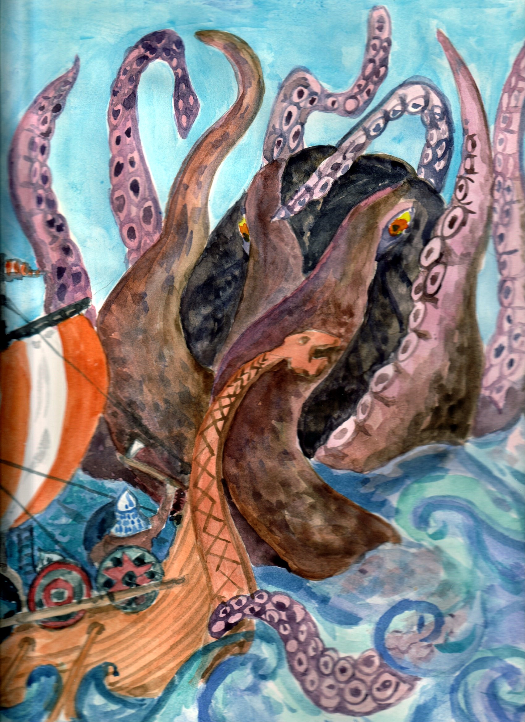 – Старая скандинавская легенда рассказывает, – принялся за историю Санто, – что однажды викинги вышли в море, чтобы отправиться к далёким островам. С собой они взяли вёльву – прорицательницу, способную видеть будущее, чтобы она указывала им путь. Но как только корабль покинул родной фьорд, провидица предсказала, что, прибыв к цели, найдут они невиданный ранее остров, который затянет их всех на дно. Викинги испугались, но возвращаться не хотелось, поэтому они продолжили плавание. Когда же они достигли намеченных островов, вода вокруг действительно забурлила, – Санто понизил голос. – Из моря поднялось нечто, что викинги сначала приняли за ещё один остров. Но, помня предостережение, моряки не стали на него сходить. А чудовище продолжало подниматься из воды и стало обвивать корабль щупальцами и тянуть на дно, – почтальон потянулся плавниками к складской стойке, словно имитируя кракена, чем произвёл сильное впечатление на Конька. – Викинги стали рубить щупальца и одержали победу над монстром.