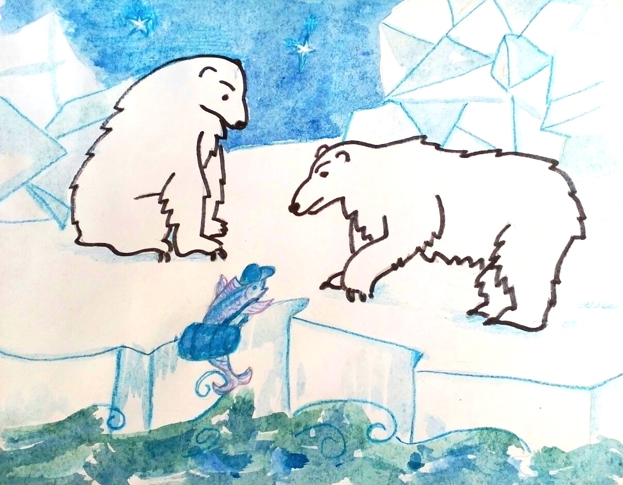 Добравшись до северных морей Санто продолжал плыть подо льдом, лишь кое-где над ним возникали светлые пятна – незамерзающие полыньи. Он думал о том, что треска приходит на нерест в эти холодные воды, значит и он когда-то икринкой уже бывал тут. Это придавало ему уверенности, и страх отступал.На Севере стояла полярная ночь. Императорский ледяной дворец возвышался над снежной равниной, обдуваемый всеми ветрами. Вьюга выла в его длинных коридорах, а метель заметала любые следы вокруг. Санто вынырнул прямо перед огромным ледяным троном, на котором развалился Император белых медведей.