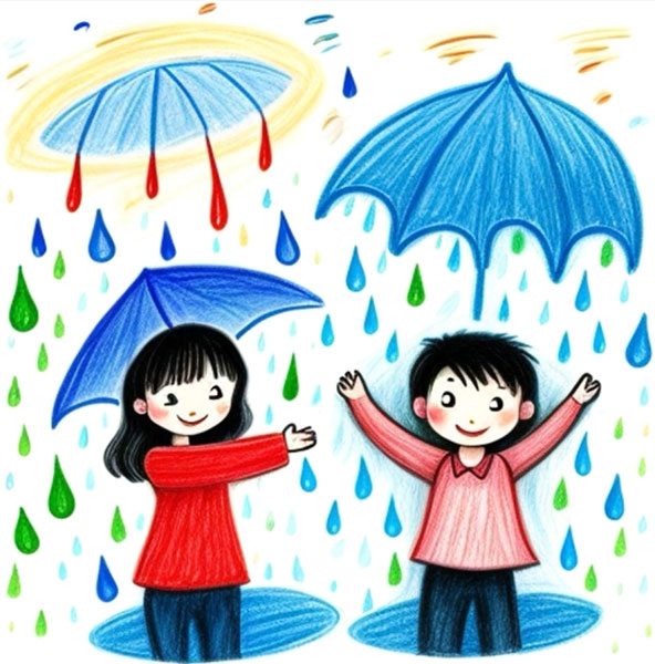 Серая туча затянула небо. Начался дождь. Дети бежали по лужам и радостно прыгали.