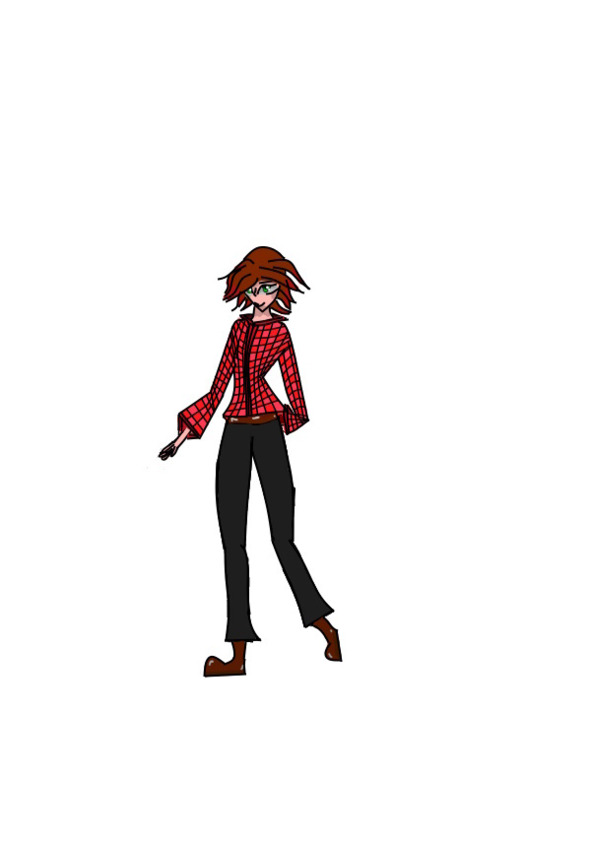 Это была девушка лет 18—19 с коричневыми, волнистыми, короткими волосами, карими глазами, красной рубашкой в клетку с рукавами до локтей и в обсидианово-чёрных штанах. Незнакомка вся потрёпанная, с царапиной на носу.
