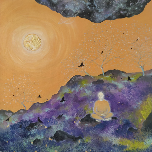 Продолжаю рисовать. Когда приходит время показывать работу миру я жадно выискиваю любую зрительскую реакцию, но нахожу лишь крохи, которые конечно же, не удовлетворяют мою амбициозную натуру. Я снова теряю веру в творчество. Очередной проигрыш складываю на полку своей памяти. Либо не то, либо не сейчас, либо что-то я опять делаю не достаточно. Не искать и не думать на этот счёт просто невозможно. Таков мой ум, ему важна мотивация с твердой почвой. Я продолжаю ходить по кругу, но все время словно глубже погружаюсь в этот поиск. Будто бы заныриваю с аквалангом, не остовляя попыток найти свой ответ. В этом поиске я нахожу тысячу ответов на всяческие вопросы, размышляю и пишу о них. Ухожу с головой в казалось бы вообще не связанные вещи и там достаю ответы. Они, тем временем, начинают трансформировать моё мировоззрение. Я уверена в том, что все реальные изменения с нами начинаются из глубины нашего недра. Из той неведомой бездны, которую мы носим в своей груди. Когда свет знания проливается из неё, он уже не может погаснуть. Он освещает нам нашу карту, по которой мы живём. Он делает её ясной, в соответствии с тем, что мы принесли с собой От Туда – из Бесконечно глубокого, наполненного энергией пространства.. Я снова стою перед чистым холстом. Цикл повторился, новый горизонт остался позади и уже виднеется следующий. Я спокойно размешиваю свои краски. До страшного знакомые краски…»