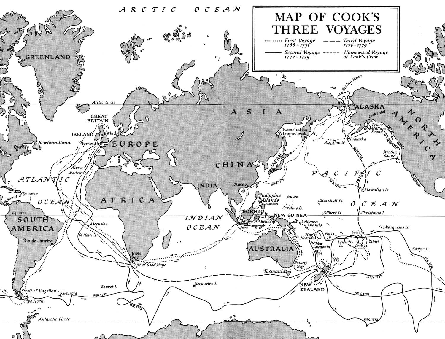 As with so many of his decisions, Cook himself has offered no explanation for this one. (Cook was an intensely secretive man – in his wanderings over the world his officers frequently complained that they never knew where they were going until they got there.) It is generally assumed that it was directly connected with the frantic re-arming taking place in Britain and France in preparation for the inevitable approach of what, the following year, was to be the beginning of the bitter and bloody Seven Years’ War: active fighting was already taking place in overseas territories, especially in North America, where Britain and France had already abandoned all pretence of diplomatic negotiations as a means of settling the question of colonial supremacy: already, although it was still nominally peace-time, the British Navy had instituted a tight blockade of the French coast to prevent further supplies of men and arms from reaching the French in Canada.