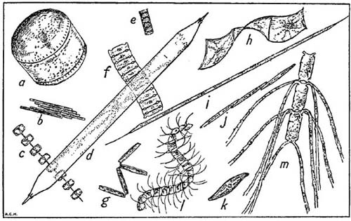 Some characteristic plankton diatoms not shown in Plate I, all magnified ×90 diam. a, Coscinodiscus concinnus; b, Bacillaria paradoxa; c, Thalassiosira gravida; d, Rhizosolenia styliformis; e, Paralia sulcata; f, Bellarochia maleus; g, Thalassiothrix nitzschioides; h, Streptotheca thamensis; i, Rhizosolenia hebetata (form semispina); j, Nitzschia seriata; k, Gyrosigma sp.; l, Chaetoceros curvisetus; m, Ch. convolutus. The actual length represented by the longer side of this figure is 1/20th of an inch.