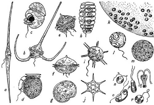 Some flagellates of the plankton. a–h, Dinoflagellates: a, Ceratium fusus (×180); b, C.macroceros (×200); c, Protoerythropsis vigilans (×320) (note clear spherical lens against dark eye-spot); d, Dinophysis acuta (×400); e, Peridinium granii (×360); f and g, P. ovatum (×320), side and top view; h, Polykrikos schwarzi (×250); i and j, the Silicoflagellate Distephanus speculum living and half of skeleton (×320); k, a very small part of the large gelatinous capsule formed by the tiny cells of Phaeocystis; l and m, Coccolithophores (×1000): Coccolithus huxleyei and Coccosphaera leptopora; n–r, some of the smallest flagellates (×1500): n, Dicrateria inornata; o, Hemiselmis rufescens; p, Isochrysis galbana; q, Pyramimonas grossii; r, Chromulina pleiades. Original drawings except c from Marshall (1925), h from Lebour (1925), m from Murray and Blackman (1898) and n to r from Parke (1949).