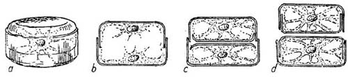 Diagrams showing the division of a simple pillbox-like type of diatom. a, a sketch of the cell before division has begun, b to d sections through the diatom after cell division to show stages in the formation of the new skeletal cell walls. Note that the upper cell in d is smaller than the original cell b.