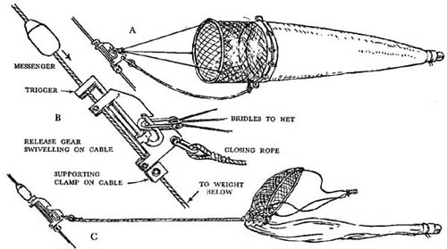 Sketches of a simple release mechanism for closing the mouth of a tow-net before hauling it to the surface. A, the rig of the net when towed; B, enlarged view of release gear about to be struck by messenger weight; C, the towing bridles released and the net closed by throttling rope.