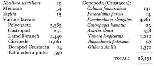 The corresponding average totals for the months of June, August and October were 39,105, 38,812 and 35,631 respectively. Since it was calculated that approximately 8 cubic metres of water were filtered by the nets during towing, this gives an average of about 4,500 animals per cubic metre or some 120 per cubic foot of sea-water during the summer months. It must be remembered that these figures are averages and that individual samples may vary enormously from week to week. For comparison it may be interesting to give the average figures for the total plants of the plankton—the diatoms and dinoflagellates—recorded from the same series of net hauls for the four months April, June, August and October; they are in round figures 5,815,000, 6,674,000, 107,000 and 485,000 respectively. It must be remembered, however, that there will have been much larger numbers of the still smaller plants, the tiny flagellates referred to here, which will have passed through the meshes of the net and so not been recorded. To give the number per cubic metre we must again divide by 8.