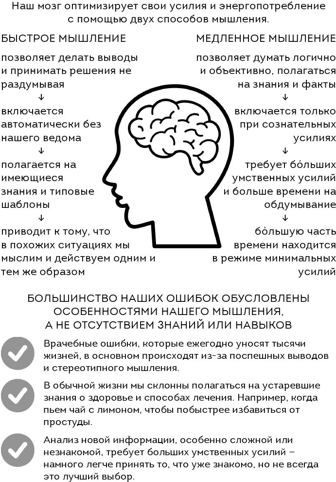 Эвристика – упрощенный способ мышления, позволяющий нам быстро делать выводы и принимать решения, не утруждая систему медленного мышления. В целом это не хорошо и не плохо. Это нормально, иногда полезно, иногда нет. В некоторых ситуациях способность думать быстро без учета всех деталей и особенностей ситуации становится «ловушкой» для нашего мозга, которая мешает объективно воспринимать окружающую нас действительность. Те же «кратчайшие пути», которые помогают врачам ставить диагнозы почти не раздумывая, ведут к врачебным ошибкам и неприятию нового. В такие ловушки мышления попадают и ученые, и врачи, и мы с вами. Как, например, случилось с венскими врачами, которые долгое время не могли найти причины родильной горячки, пока однажды молодой врач Игнац Земмельвейс не смог взглянуть на проблему под новым углом.