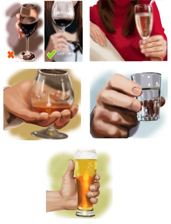 Бокалы для красного, белого вина и шампанского держат исключительно за ножку, причем как минимум тремя пальцами (чем полнее сосуд, тем сложнее его удержать, так что этикет не запрещает использовать все пять пальцев). Не нужно манерно хвататься за подставку – так поступают только опытные сомелье и владельцы собственных винных погребов. Подражание профи только демонстрирует желание выделиться. Это касается и оттопыренного в сторону мизинца.