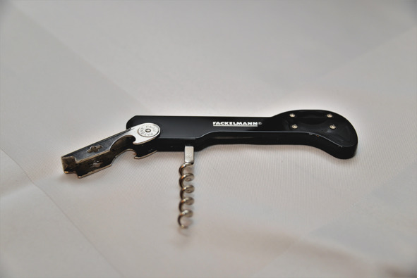 Удобный складной штопор, придуманный французскими сомелье – сотрудниками ресторана, отвечающими за поставку и хранение вин в заведении, а также представление напитков клиентам. Кроме стального винта устройство снабжено лезвием для снятия фольги и двумя ступеньками, упрощающими открытие бутылки.