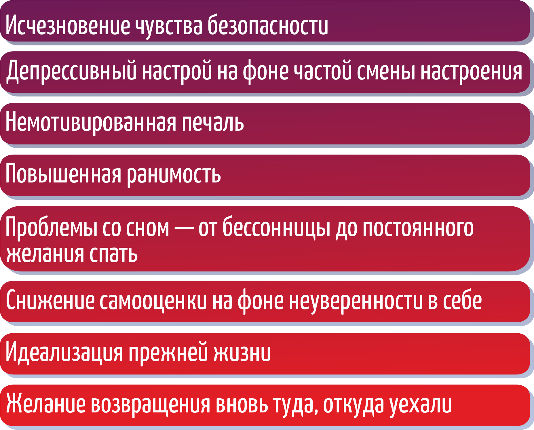 Разочарование и невозможность в одночасье преодолевать житейские барьеры, непривычные для прежней жизни, отражаются на состоянии здоровья человека, вплоть до депрессивного настроя.