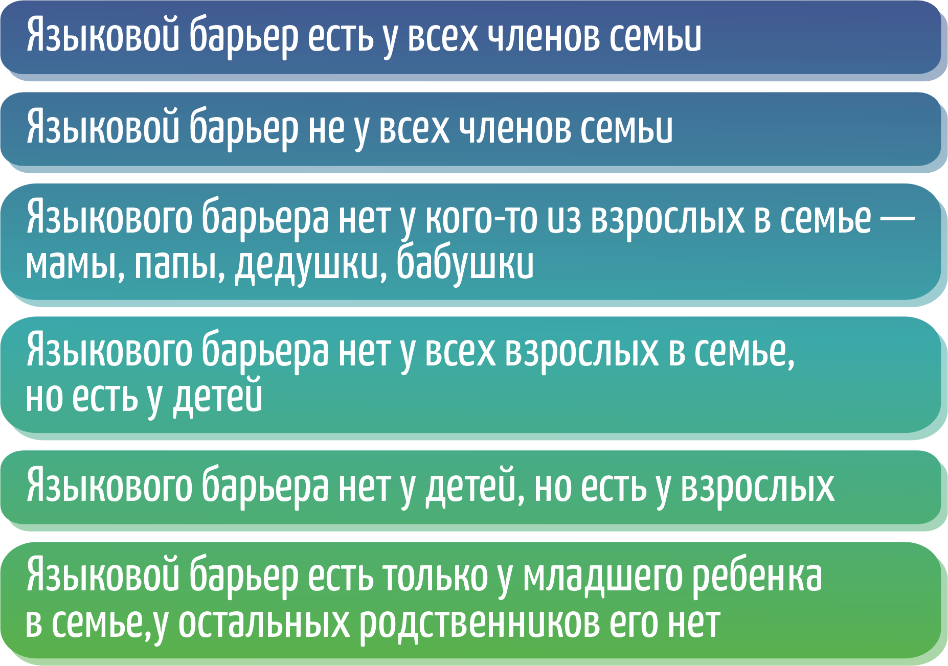 Обычно камнем преткновения для успешного осуществления планов эмиграции и благоприятного завершения всех стадий культурного шока бывает языковой барьер. Несмотря на то, что родители знают об этом барьере, ребенок даже подросткового возраста не всегда понимает, о чем речь. Но барьер есть барьер, и его надо преодолеть. Кому-то это удается легче, кому-то тяжелее. Стресс преодоления испытывают как дети, так и взрослые. Но взрослым надо приспосабливаться не только к своим стрессогенным ситуациям, но и к истерикам детей типа «не пойду в школу, не понимаю, о чем говорит учитель…», «не хочу в детский сад, там говорят не на моем языке…».