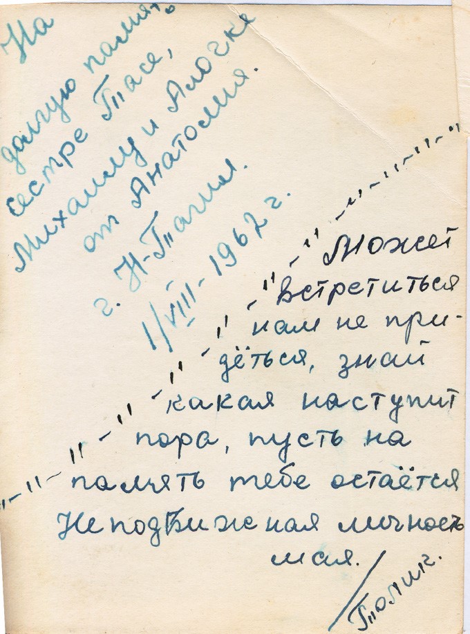 Дорогому другу моей жизни Тасеньке, милой подружке-уралочке, от Тамары, вредного и противного человека. 2 сентября 1956г. Комсомольск на Амуре. (вместе за партой в детском доме и педучилище, в центре).
